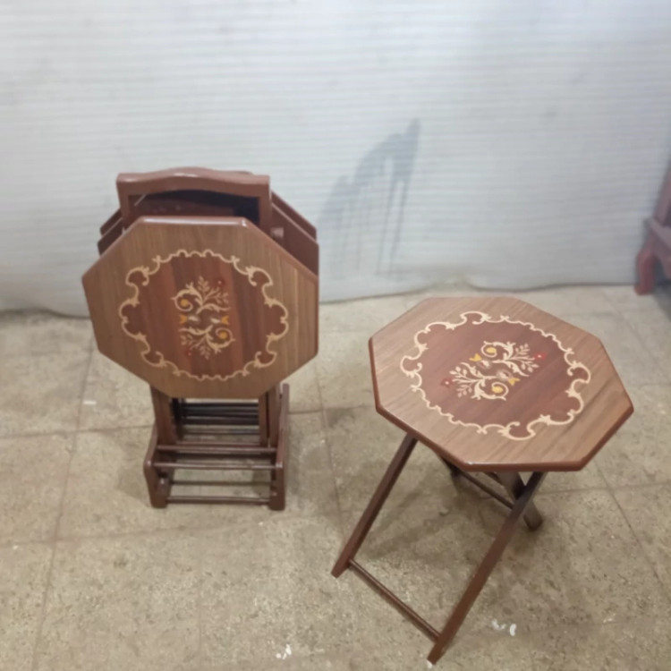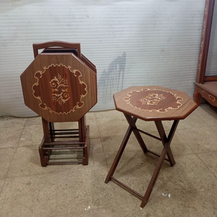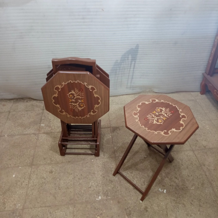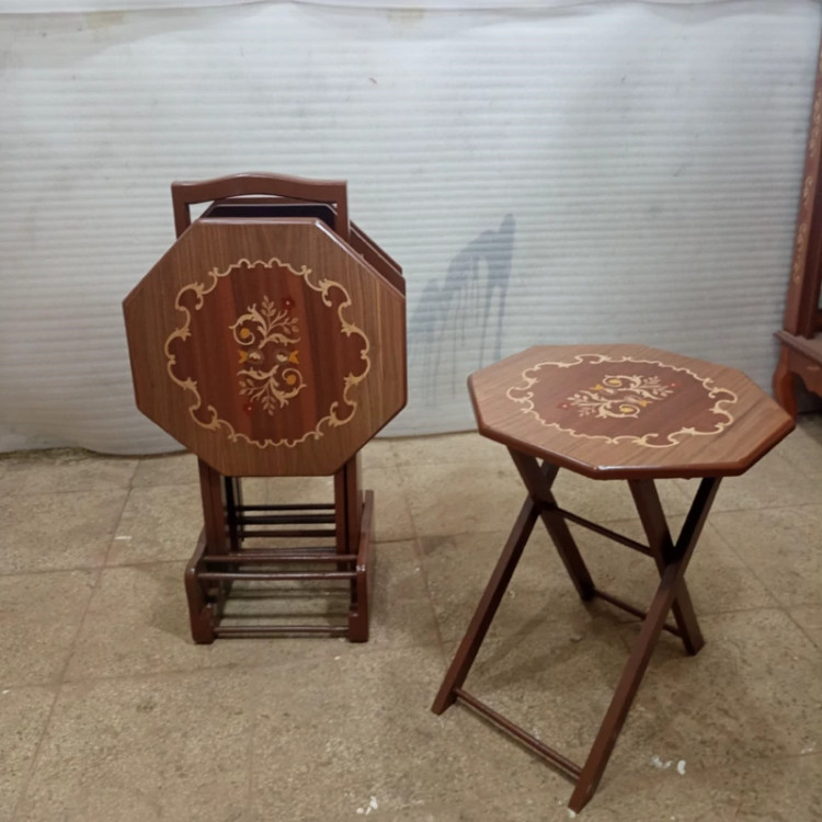 میز عسلی چهارتیکه تاشو هشت ضلعی معرق فروش به صورت نقد و اقساط چوب راش گرجستان ضمانت 36 ماهه بسیار شیک و زیبا و کمجا