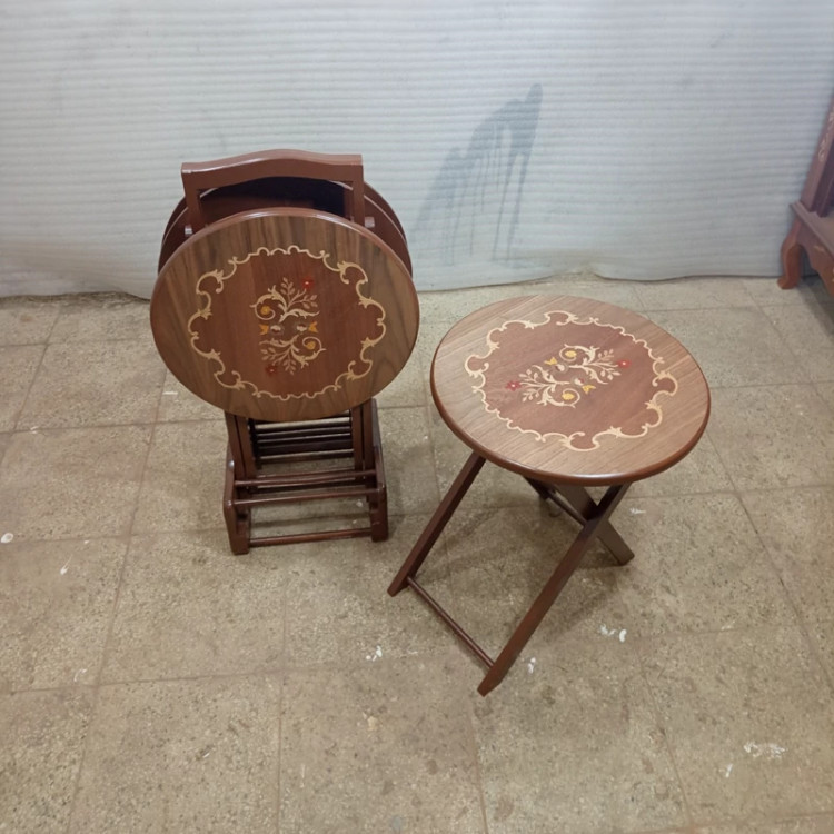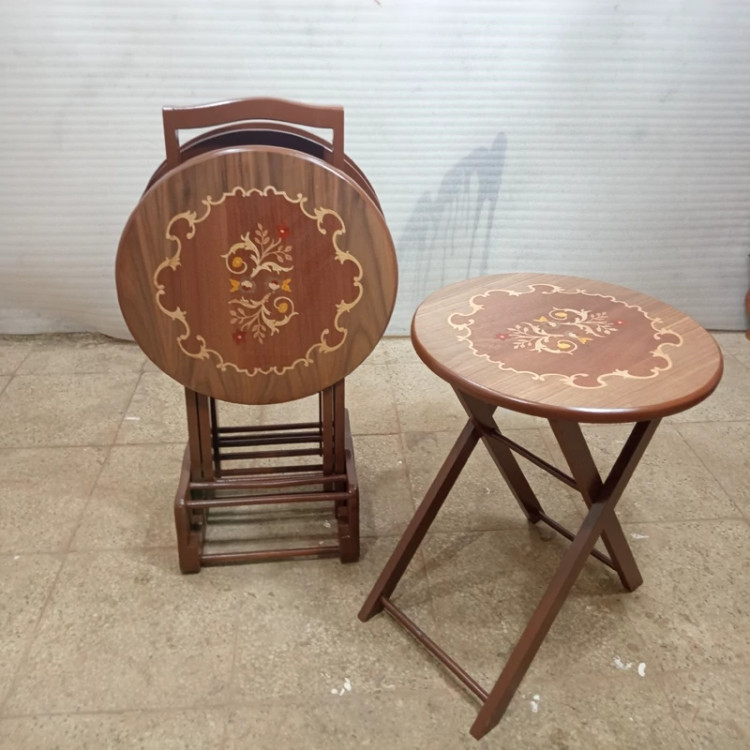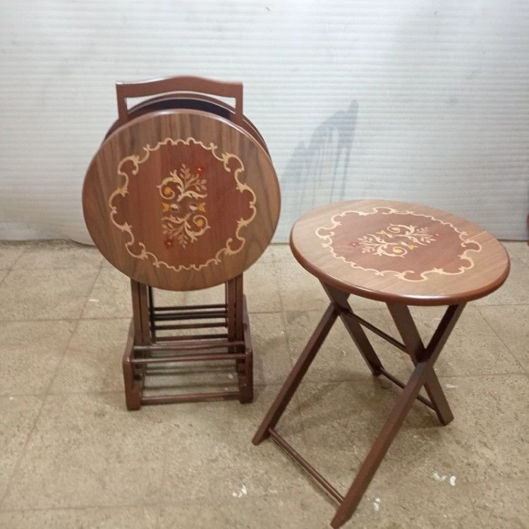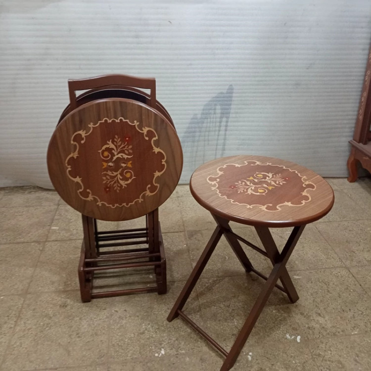 میز عسلی چهارتیکه تاشو گرد معرق فروش به صورت نقد و اقساط چوب راش گرجستان ضمانت 36 ماهه بسیار شیک و زیبا و کمجا